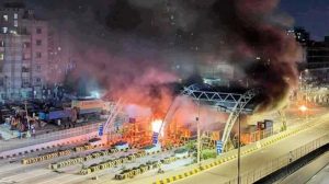 বুধবার (১৭ জুলাই) রাত ১০টার দিকে এ ঘটনা ঘটে। শিক্ষার্থী ও পুলিশের সঙ্গে দফায় দফায় ধাওয়া-পাল্টা ধাওয়া হয়। শনিরআখড়ার কাজলায় হানিফ ফ্লাইওভারের টোল প্লাজায় আগুন দেওয়া হয়েছে। ঘটনাস্থলের পাশেই ফায়ার সার্ভিসের গাড়ি রয়েছে।