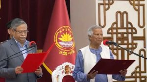 অন্তর্বর্তীকালীন সরকারের প্রধান উপদেষ্টা হিসেবে শপথ নিলেন নোবেলজয়ী অর্থনীতিবিদ ড. মুহাম্মদ ইউনূস। এই সরকারের উপদেষ্টা হিসেবে আরও ১৬ জন শপথ নিয়েছেন।