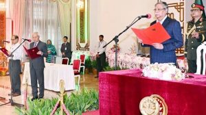 অন্তর্বর্তীকালীন সরকারের প্রধান উপদেষ্টা হিসেবে গত বৃহস্পতিবার রাতে শপথ নেন নোবেলজয়ী ড. মুহাম্মদ ইউনূস। রাষ্ট্রপতি মো. সাহাবুদ্দিন বঙ্গভবনের দরবার হলে তাঁকে শপথ পাঠ করান। পরে শপথ নেন অন্তর্বর্তীকালীন সরকারের আরও ১৩ উপদেষ্টা। নতুন দুইজন শপথ নেয়া অন্তর্বর্তীকালীন সরকারে উপদেষ্টার সংখ্যা হলো ১৬ জন।