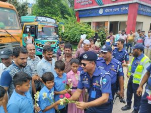 সীতাকুণ্ডের ফৌজদারহাটে শিক্ষার্থীদের হাতে ফুল তুলে দিয়ে ট্রাফিক পুলিশের কার্যক্রম শুরু করা হয়েছে।